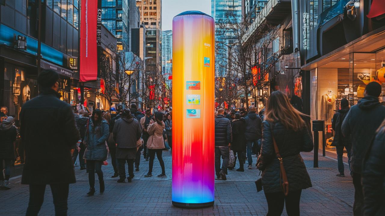 Les dimensions disponibles sont variées pour s'adapter à chaque contexte : de la colonne de 2,5 mètres de hauteur avec un diamètre de 50 centimètres jusqu'aux modèles imposants de 4 mètres de hauteur avec un diamètre d'un mètre. Cette diversité permet de choisir la structure la plus appropriée selon l'espace disponible et l'impact visuel recherché. Les totems publicitaires offrent une visibilité panoramique qui garantit que votre message sera vu sous tous les angles, augmentant considérablement les chances d'attirer de nouveaux clients ou partenaires.
